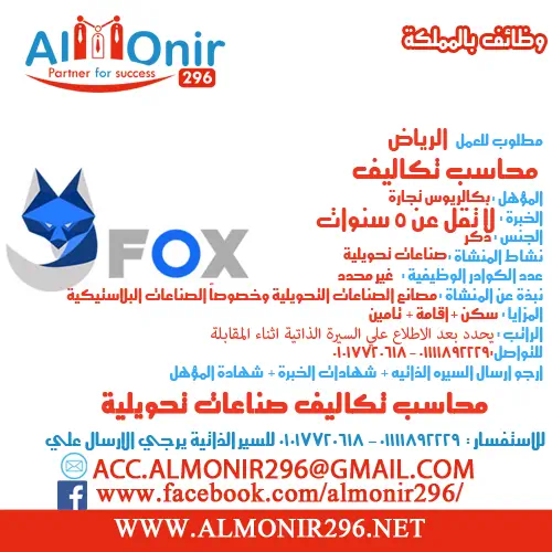 careers@almonir296.netيمكنك متابعة كافة الوظائف المعلن عنها وتسجيل اعجابك بصفحتنا على موقع التواصل الاجتماعى Facebook :www.facebook.com/almonir296#فرص_عمل #وظائف_خالية #سفر_للخارج#المنير_لالحاق_الكوادر_المصرية_للخارجwww.almonir296.net