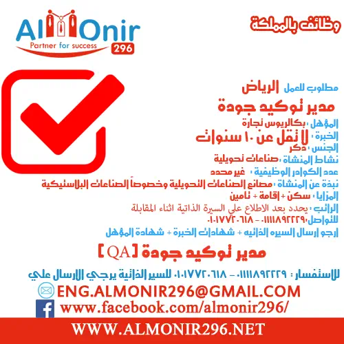 careers@almonir296.netيمكنك متابعة كافة الوظائف المعلن عنها وتسجيل اعجابك بصفحتنا على موقع التواصل الاجتماعى Facebook :www.facebook.com/almonir296#فرص_عمل #وظائف_خالية #سفر_للخارج#المنير_لالحاق_الكوادر_المصرية_للخارجwww.almonir296.net