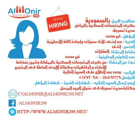 careers@almonir296.netيمكنك متابعة كافة الوظائف المعلن عنها وتسجيل اعجابك بصفحتنا على موقع التواصل الاجتماعى Facebook :www.facebook.com/almonir296#فرص_عمل #وظائف_خالية #سفر_للخارج#المنير_لالحاق_الكوادر_المصرية_للخارجwww.almonir296.net