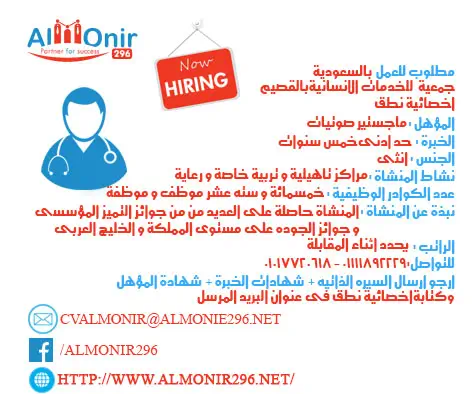 برجاء ارسال السيرة الذاتية وكتابة كلمة ( اخصائيه نطق ) فى عنوان البريد المرسل