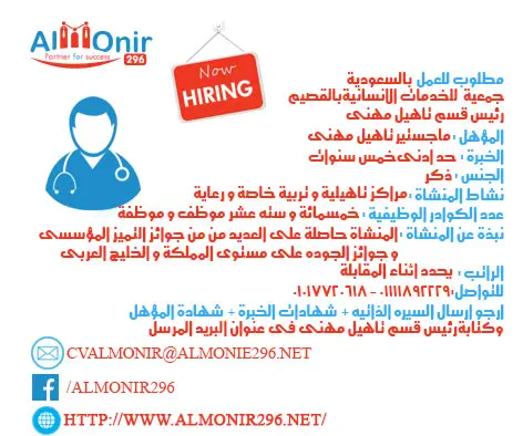 برجاء ارسال السيرة الذاتية وكتابة كلمة ( رئيس قسم تأهيل مهنى ) فى عنوان البريد المرسل