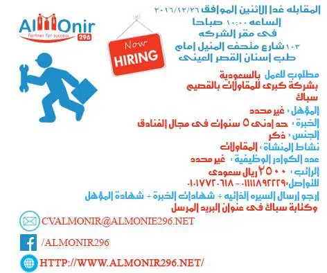 careers@almonir296.netيمكنك متابعة كافة الوظائف المعلن عنها وتسجيل اعجابك بصفحتنا على موقع التواصل الاجتماعى Facebook :www.facebook.com/almonir296#فرص_عمل #وظائف_خالية #سفر_للخارج#المنير_لالحاق_الكوادر_المصرية_للخارجwww.almonir296.net