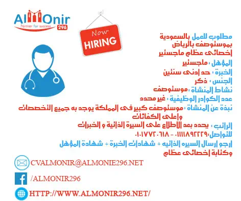 careers@almonir296.netيمكنك متابعة كافة الوظائف المعلن عنها وتسجيل اعجابك بصفحتنا على موقع التواصل الاجتماعى Facebook :www.facebook.com/almonir296#فرص_عمل #وظائف_خالية #سفر_للخارج#المنير_لالحاق_الكوادر_المصرية_للخارجwww.almonir296.net