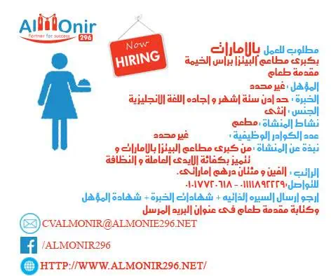 careers@almonir296.netيمكنك متابعة كافة الوظائف المعلن عنها وتسجيل اعجابك بصفحتنا على موقع التواصل الاجتماعى Facebook :www.facebook.com/almonir296#فرص_عمل #وظائف_خالية #سفر_للخارج#المنير_لالحاق_الكوادر_المصرية_للخارجwww.almonir296.net