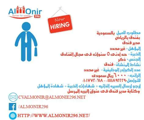 careers@almonir296.netيمكنك متابعة كافة الوظائف المعلن عنها وتسجيل اعجابك بصفحتنا على موقع التواصل الاجتماعى Facebook :www.facebook.com/almonir296#فرص_عمل #وظائف_خالية #سفر_للخارج#المنير_لالحاق_الكوادر_المصرية_للخارجwww.almonir296.net