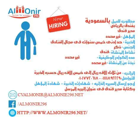 careers@almonir296.netيمكنك متابعة كافة الوظائف المعلن عنها وتسجيل اعجابك بصفحتنا على موقع التواصل الاجتماعى Facebook :www.facebook.com/almonir296#فرص_عمل #وظائف_خالية #سفر_للخارج#المنير_لالحاق_الكوادر_المصرية_للخارجwww.almonir296.net