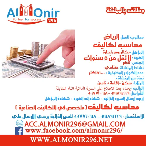 مطلوب محاسبين تكاليف للعمل بالمملكة
