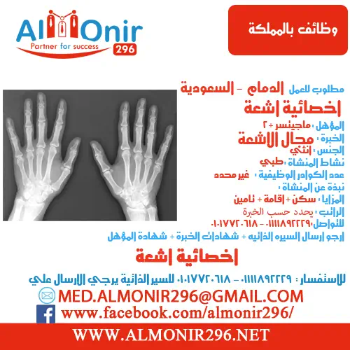 careers@almonir296.netيمكنك متابعة كافة الوظائف المعلن عنها وتسجيل اعجابك بصفحتنا على موقع التواصل الاجتماعى Facebook :www.facebook.com/almonir296#فرص_عمل #وظائف_خالية #سفر_للخارج#المنير_لالحاق_الكوادر_المصرية_للخارجwww.almonir296.net
